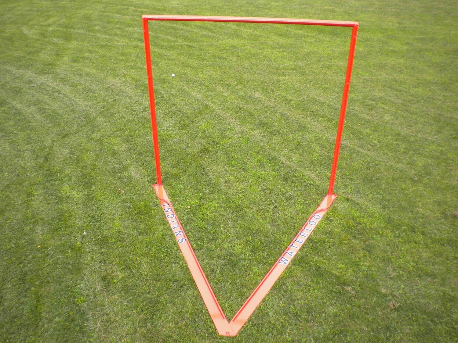 Two-piece construction with heavy duty 1.9 inch powder coated steel pipe. 4 inch flat base bar. Welded lacing bar around base of goal for easy net attachment. Durable Customized Graphics are available on the base and uprights of the Lacrosse Goal Frame. Welded lacing bar around base of goal for easy net attachment.